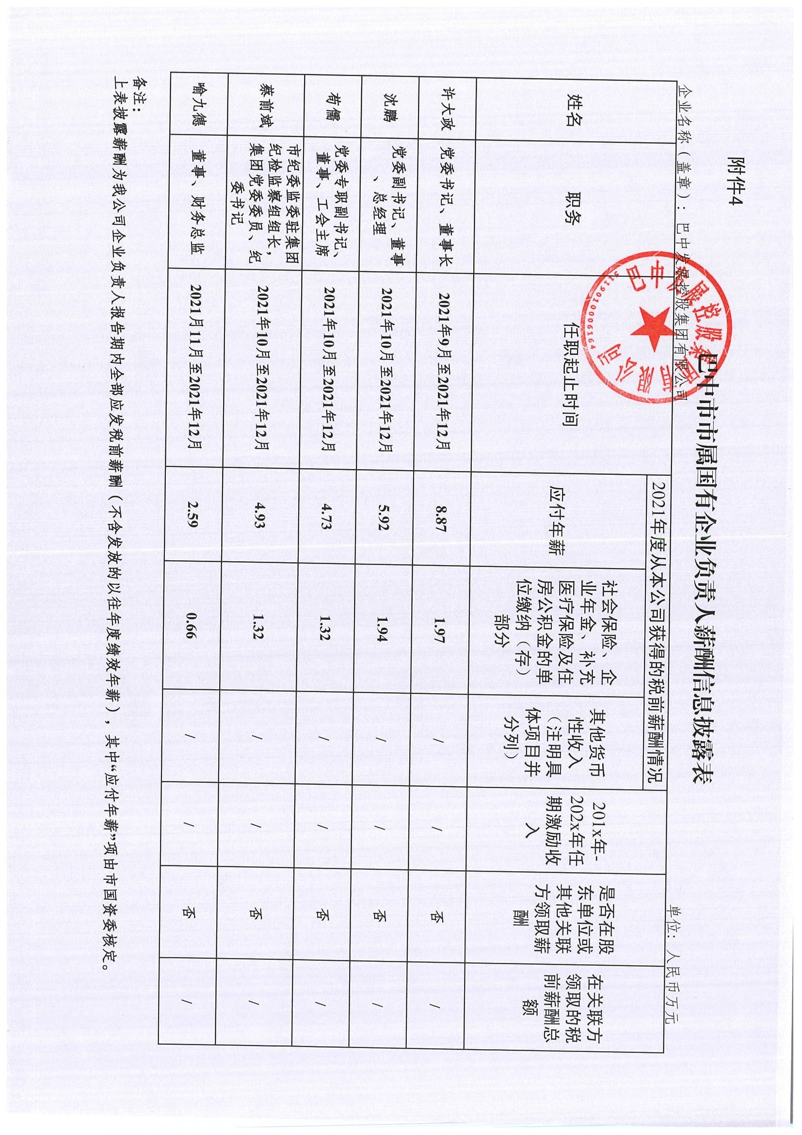 巴中市市屬國有企業(yè)負責(zé)人薪酬信息披露表